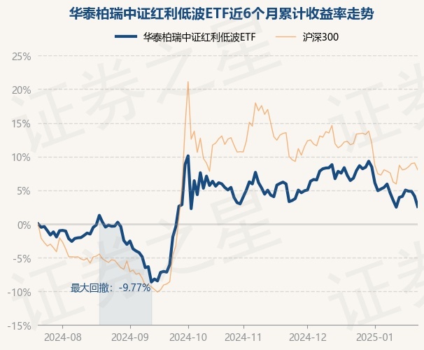 本站消息,1月22日,华泰柏瑞中证红利低波ETF最新单位净值为1.0605元,累计净值为2.121元,较前一交易日下跌1.47%。历史数据显示该基金近1个月下跌3.63%,近3个月下跌3.33%,近6个月上涨2.58%,近1年上涨18.45%。该基金近6个月的累计收益率走势如下图: